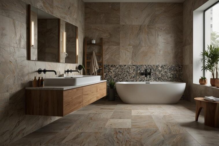 Badezimmer mit großen Fliesen: Naturstein- und Holzlook kombinieren