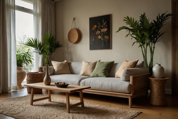 Natürliche Deko mit Bambusjalousien und warmen Lichtquellen