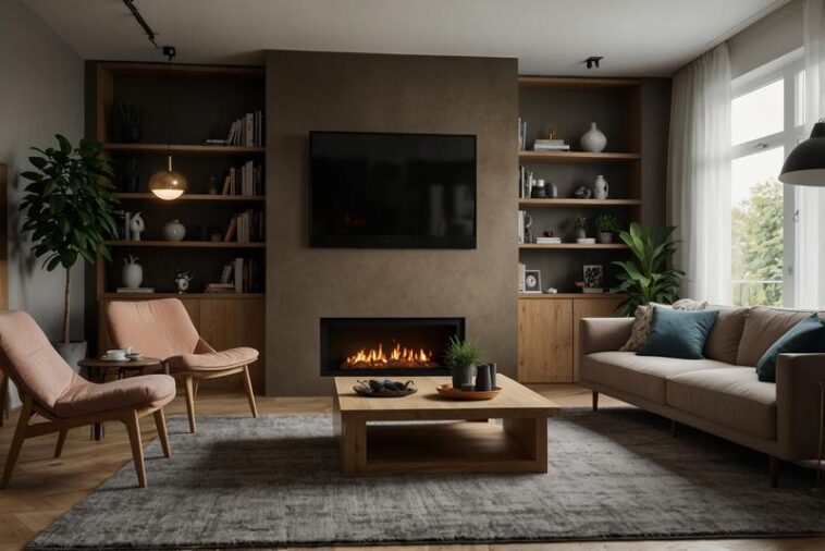 Wohnzimmer mit Kamin oder Kaminoptik für Gemütlichkeit