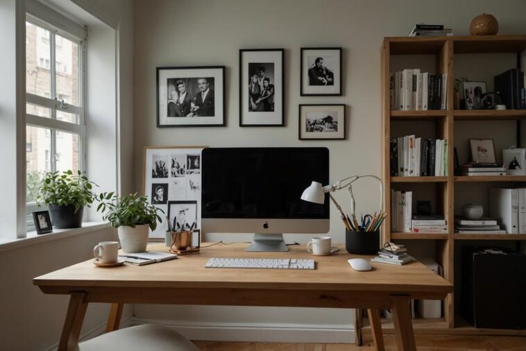 Wandgalerie über dem Homeoffice-Schreibtisch mit gerahmten Fotos