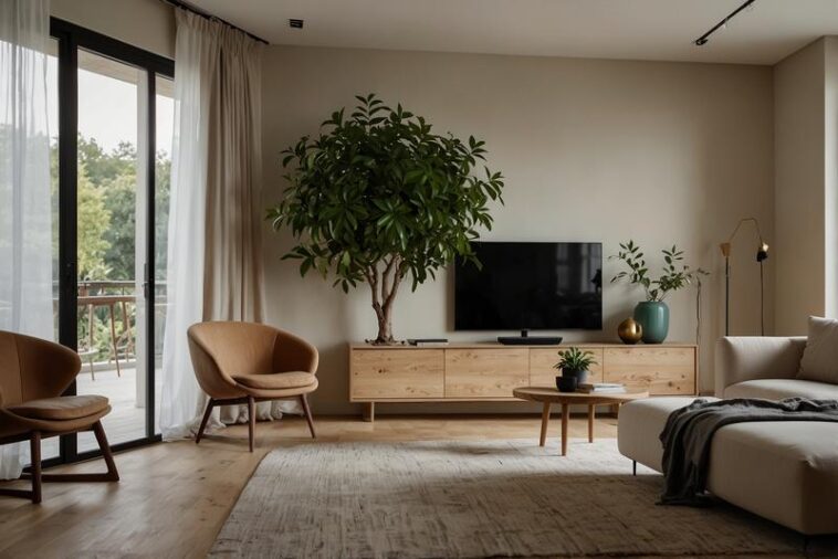 Materialien wie helle Hölzer, matte Oberflächen oder zurückhaltende Farben ergänzen die minimalistische Gestaltung, ohne Dominanz zu erzeugen. Offene Regale oder schmale Sideboards in zurückhaltendem Design bieten ausreichend Stauraum für Mediengeräte und Accessoires, ohne den Raum zu überladen. Auch die Integration von verdeckten Beleuchtungselementen wie LED-Streifen hinter dem Fernseher oder in den Regalen fördert eine angenehme Atmosphäre und löst harsche Lichtkontraste auf.