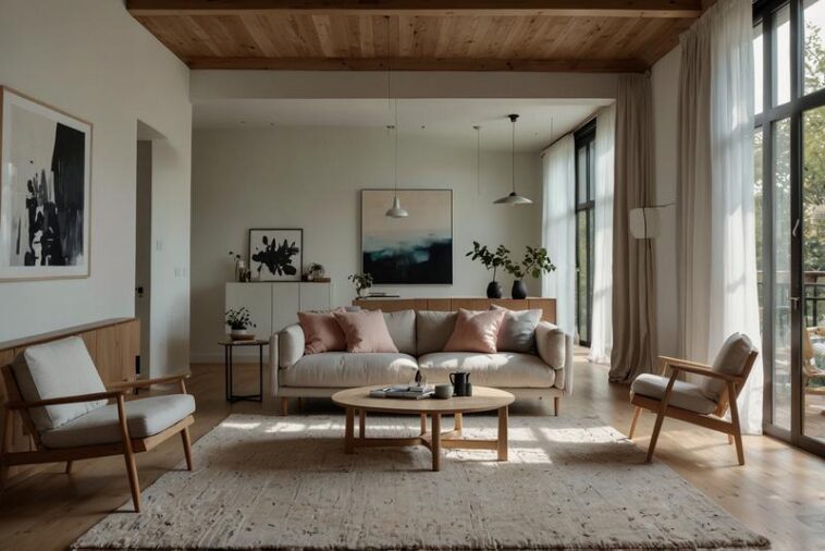 Luftige Gardinen aus leichten Stoffen wie Voile oder feinem Baumwoll-Musselin unterstützen diesen Effekt, indem sie Licht sanft filtern, ohne den Raum zu verdunkeln. Transparente oder halbtransparente Vorhänge in cremefarbenen, hellgrauen oder blassen Pastelltönen fügen sich harmonisch in das Gesamtbild ein und schaffen eine luftig-leichte Atmosphäre.