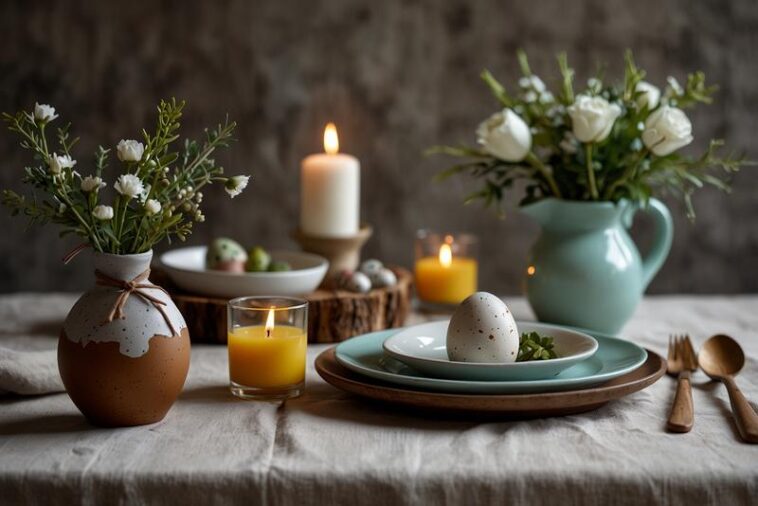 Eine minimalistische Oster-Tischdeko, die auf Naturmaterialien setzt, schafft eine zeitgemäße und zugleich gemütliche Atmosphäre. Dabei steht die Reduktion auf das Wesentliche im Vordergrund: Natürliche Elemente wie frische Zweige, filigrane Gräser, Holzstücke und unbehandelte Steine bilden die Basis. Diese sorgen für eine harmonische Verbindung zwischen dem traditionellen Osterfest und modernem Design. Sanfte, erdige Farben dominieren das Farbspektrum und verleihen dem Tisch eine ruhige, elegante Ausstrahlung. Ergänzt werden kann das Arrangement durch kleine Osterakzente wie geflochtene Osterkörbchen aus Weide oder einige kunstvoll platzierte Bio-Eier in gedeckten Pastelltönen. Die Verwendung von Leinen- oder Baumwolltischläufern unterstreicht den nachhaltigen Charakter der Dekoration. Ein weiterer Vorteil dieser Gestaltung ist die Einfachheit im Auf- und Abbau, was besonders bei mehrtägigen Feierlichkeiten praktisch ist. Minimalistische Oster-Tischdekoration mit Naturmaterialien verbindet Ästhetik und Umweltbewusstsein und eignet sich perfekt, um einen modernen Oster-Brunch stilvoll in Szene zu setzen.