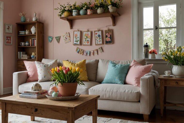 Bunte DIY-Girlanden sind eine einfache und effektive Möglichkeit, das Wohnzimmer an Ostern in eine lebendige Erlebniswelt zu verwandeln. Mit handgefertigten Girlanden lassen sich Farbenspiele und fröhliche Motive direkt über dem Sofa inszenieren, wodurch ein einladender und festlicher Blickfang entsteht. Besonders beliebt sind Girlanden aus Papier, Filz oder Stoff, die mit Ostereiern, Hasenmotiven, Frühlingsblumen oder bunten Pompons verziert werden. Diese Materialien lassen sich leicht zuschneiden, kleben und kombinieren, sodass individuell gestaltete Dekorationen entstehen. Die Kombination von Pastelltönen, leuchtenden Farben und natürlichen Elementen sorgt für Harmonie und Frische im Raum. Außerdem trägt die hängende Dekoration zur räumlichen Tiefe bei und schafft eine verspielte Atmosphäre, die an Frühlingserwachen und Osterfreuden erinnert. DIY-Girlanden können zudem auf unterschiedliche Längen angepasst werden, um sie optimal an die Raumgröße anzupassen. Die Verwendung nachhaltiger und wiederverwertbarer Materialien unterstützt außerdem den Trend zu umweltbewusster Gestaltung und unterstreicht die liebevolle Vorbereitung auf die Feiertage. Letztlich bieten bunte Girlanden über dem Wohnzimmer-Sofa eine charmante Möglichkeit, Kreativität mit österlicher Stimmung zu verbinden.