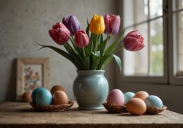 Ein dekorativer Korb mit gefärbten Ostereiern ist eine charmante und natürliche Möglichkeit, den Flur österlich zu gestalten. Besonders wirkungsvoll ist die Kombination mit einem rustikalen Leinentuch, das locker auf dem Boden ausgebreitet wird. Die Leinenstruktur verleiht der Szene eine angenehme, handgemachte Note und bildet einen schönen Kontrast zu den glänzenden, farbigen Eiern. Gefärbte Eier in Pastelltönen wie Hellblau, zartes Rosa oder sanftes Gelb bringen Frühlingsfrische und Harmonie in den Eingangsbereich. Daneben bieten auch natürlich gefärbte Eier mit Zwiebelschalen oder Rote-Bete-Saft eine nachhaltige Alternative. Der Korb kann mit kleinen Zweigen, Moos oder getrockneten Blumen ergänzt werden, um die österliche Atmosphäre zu verstärken. Diese Kombination lädt Gäste ein und schafft sofort eine freundliche, einladende Stimmung. Zudem passt die Dekoration ausgezeichnet zu verschiedenen Einrichtungsstilen von skandinavisch bis Landhaus. Der Flur wird so zu einem Ort, der nicht nur praktisch ist, sondern auch saisonale Akzente setzt und den Frühling willkommen heißt.
