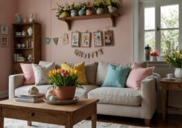 Eine Vase mit frischen oder künstlichen Zweigen verleiht dem Flur sofort einen natürlichen und lebendigen Akzent. Besonders beliebt sind Zweige von Weide, Forsythie oder Kirschbaum, da sie robust sind und eine schöne Struktur bieten. Für die Osterzeit lassen sich an diesen Zweigen dekorative, hängende Eier in verschiedenen Farben und Designs befestigen. Besonders wirkungsvoll sind Ostereier aus Keramik, Holz oder gefärbtem Naturmaterial, die mit Bändern oder kleinen Haken befestigt werden. Diese Kombination aus zarten Zweigen und liebevoll gestalteter Osterdekoration sorgt für eine freundliche und einladende Atmosphäre direkt beim Betreten des Hauses. Darüber hinaus kann die Vase mit weiteren saisonalen Elementen wie Moos, kleinen Nestern oder Federn ergänzt werden, um die natürliche Optik zu verstärken. Diese einfache, aber effektvolle Dekoidee ermöglicht es, den Flur österlich zu gestalten, ohne dabei zu viel Platz zu beanspruchen. Sie eignet sich hervorragend, um Gäste sofort in Frühlingsstimmung zu versetzen und das Osterfest mit einem charmanten Flair zu begrüßen.