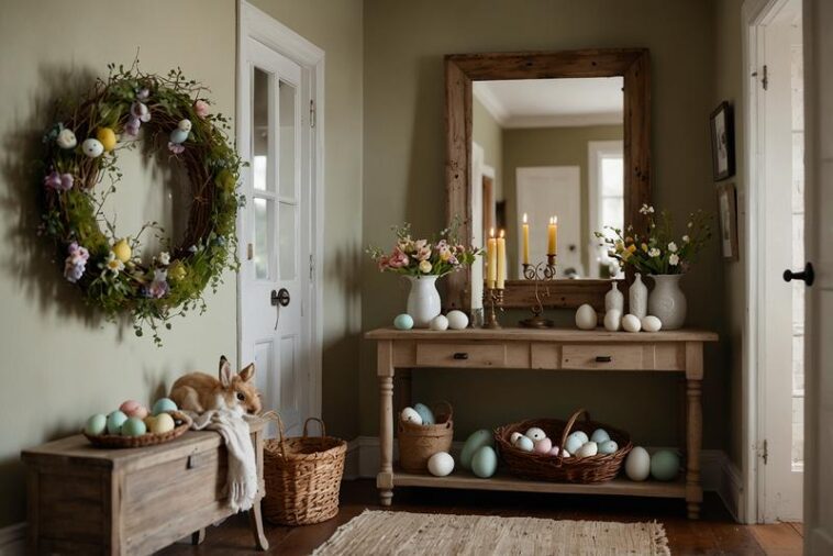 Eine Konsole im Flur eignet sich hervorragend, um eine einladende Oster-Atmosphäre zu schaffen. Besonders beliebt sind dekorative Hasenfiguren, die in unterschiedlichen Größen und Materialien wie Keramik oder Holz bezaubern. Sie symbolisieren nicht nur den Frühling, sondern sind auch ein klassisches Oster-Motiv. Ergänzt werden kann das Arrangement durch kleine Nester, die mit kunstvoll drapierten Eiern aus Holz, Kunststoff oder natürlichen Materialien bestückt sind. Diese bringen zusätzlich Textur und einen natürlichen Look in den Eingangsbereich.