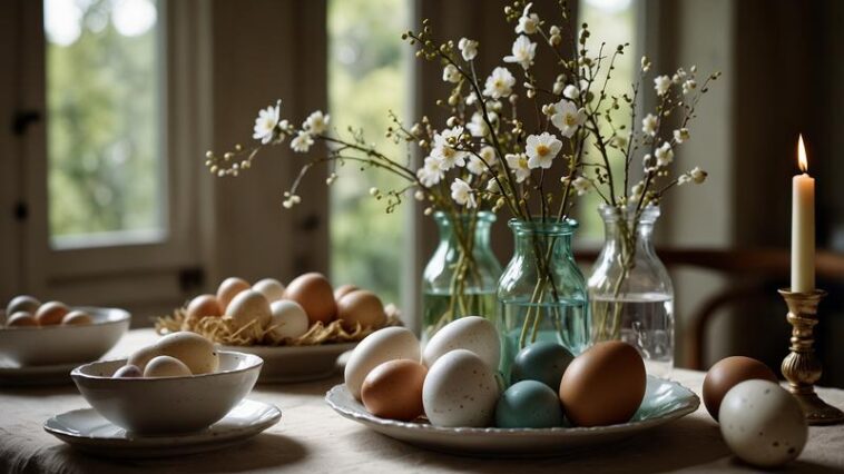 Glasvasen mit Federn und Eiern als Esszimmer-Mittelstück Ein Glasvasen-Mittelstück mit Federn und Eiern verleiht dem Esszimmer zu Ostern eine natürliche und zugleich elegante Atmosphäre. Die Kombination von gläsernen Vasen mit verschiedenfarbigen und -großen Eiern sorgt für visuelle Vielfalt und lädt zum Verweilen ein. Dabei können die Federn in sanften Pastelltönen wie Creme, Hellblau oder zartem […] weiterlesen